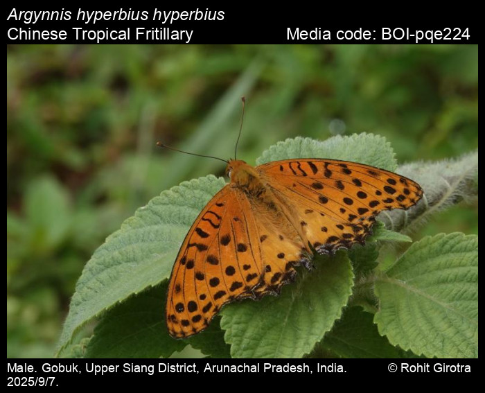 Anonymous 2025. Argynnis hyperbius (Linnaeus, 1763) – Tropical Fritillary. In Kunte, K., S. Sondhi, and P. Roy (Chief Editors). Butterflies of India, v. 4.12. Published by the Indian Foundation for Butterflies. URL: https://www.ifoundbutterflies.org/argynnis-hyperbius, accessed 2025/10/16.