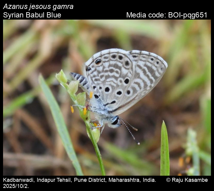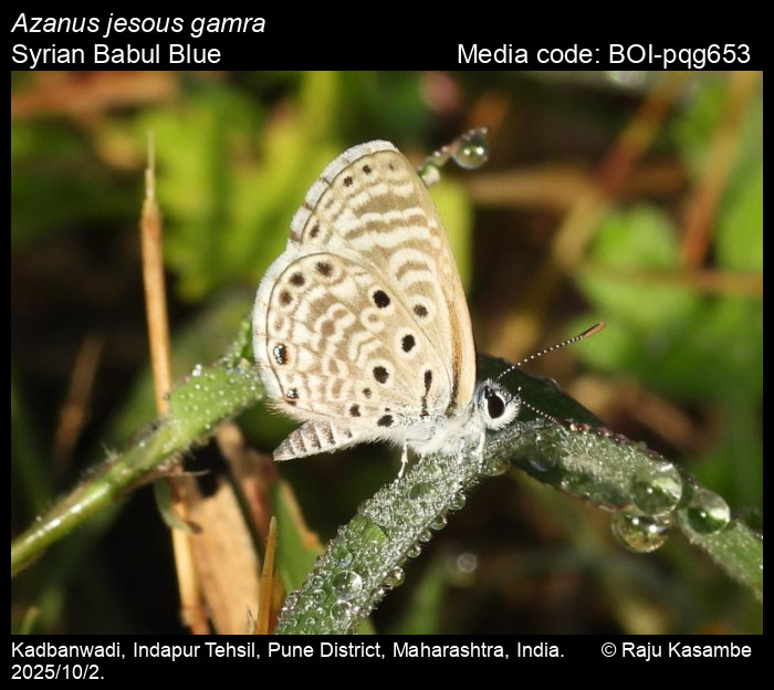 Bhakare, M., and Prashanth S. N. 2025. Azanus jesous (Guérin-Méneville, 1849) – African Babul Blue. In Kunte, K., S. Sondhi, and P. Roy (Chief Editors). Butterflies of India, v. 4.12. Published by the Indian Foundation for Butterflies. URL: https://www.ifoundbutterflies.org/azanus-jesous, accessed 2025/12/06.
