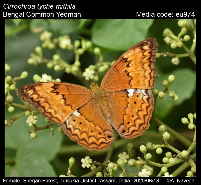 Anonymous 2025. Cirrochroa tyche C. & R. Felder, 1861 – Common Yeoman. In Kunte, K., S. Sondhi, and P. Roy (Chief Editors). Butterflies of India, v. 4.12. Published by the Indian Foundation for Butterflies. URL: https://www.ifoundbutterflies.org/cirrochroa-tyche, accessed 2025/12/06.