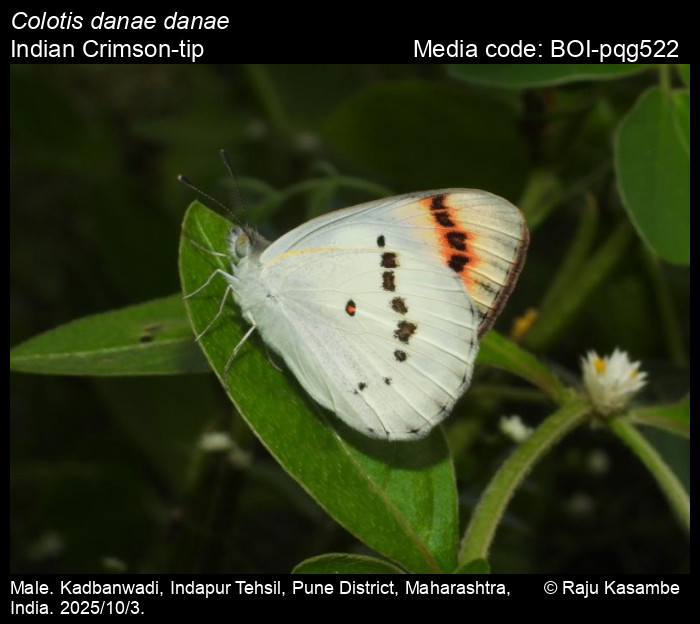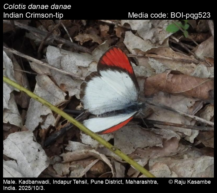 Saji K. and M. Bhakare 2025. Colotis danae (Fabricius, 1775) – Crimson-tip. In Kunte, K., S. Sondhi, and P. Roy (Chief Editors). Butterflies of India, v. 4.12. Published by the Indian Foundation for Butterflies. URL: https://www.ifoundbutterflies.org/colotis-danae, accessed 2025/12/06.
