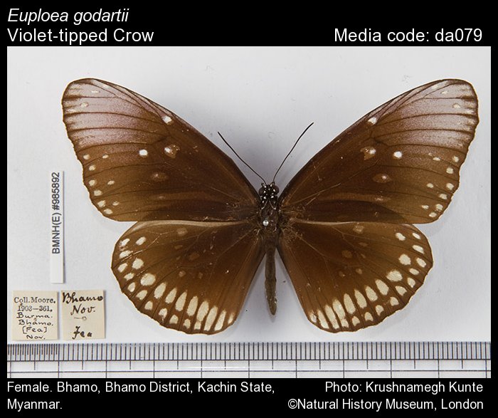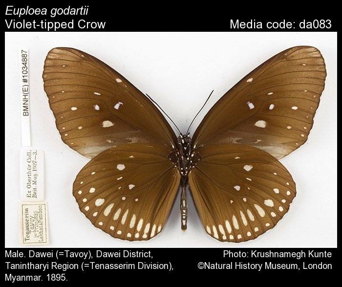 Anonymous 2025. Euploea godartii Lucas, 1853 – Violet-tipped Crow. In Kunte, K., S. Sondhi, and P. Roy (Chief Editors). Butterflies of India, v. 4.12. Published by the Indian Foundation for Butterflies. URL: https://www.ifoundbutterflies.org/euploea-godartii, accessed 2025/10/30.