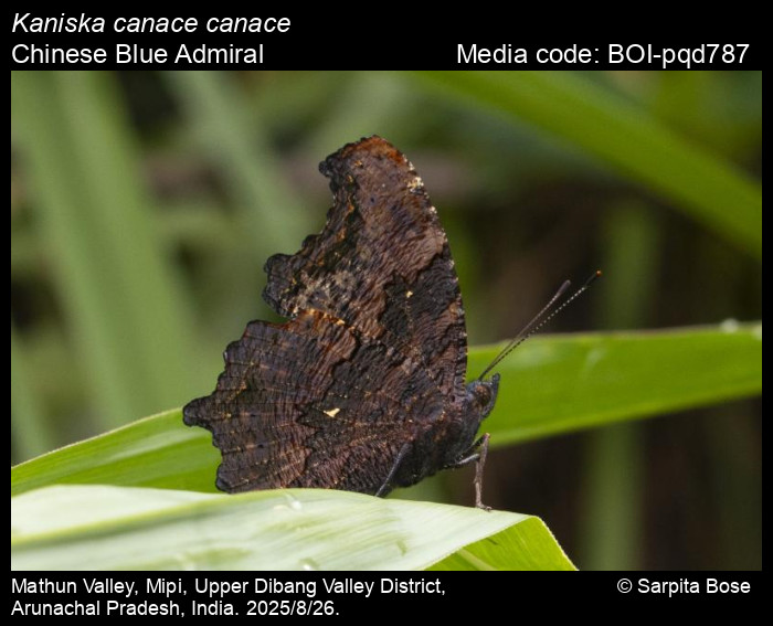 Kunte, K., K. Saji & Manoj P 2025. Kaniska canace (Linnaeus, 1763) – Blue Admiral. In Kunte, K., S. Sondhi, and P. Roy (Chief Editors). Butterflies of India, v. 4.12. Published by the Indian Foundation for Butterflies. URL: https://www.ifoundbutterflies.org/kaniska-canace, accessed 2025/10/07.
