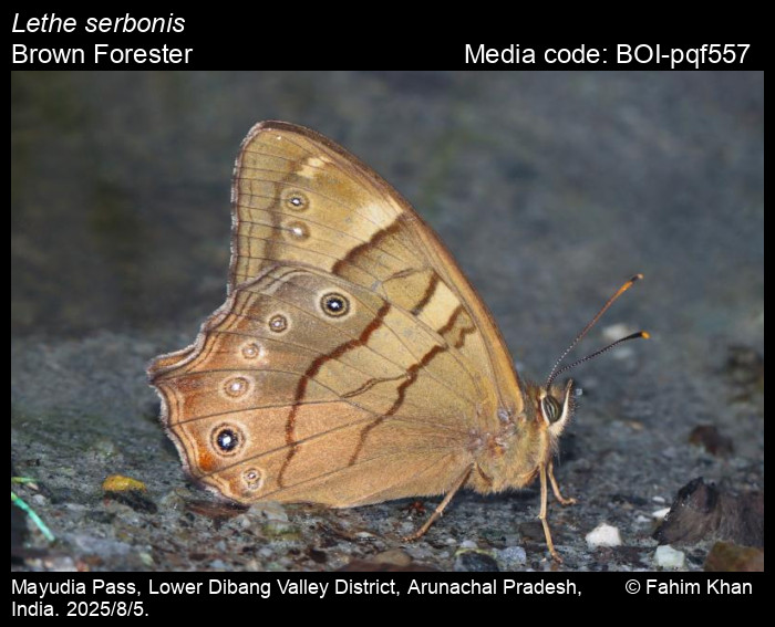 Anonymous 2025. Lethe serbonis (Hewitson, 1876) – Brown Forester. In Kunte, K., S. Sondhi, and P. Roy (Chief Editors). Butterflies of India, v. 4.12. Published by the Indian Foundation for Butterflies. URL: https://www.ifoundbutterflies.org/lethe-serbonis, accessed 2025/12/06.