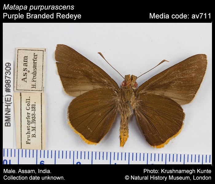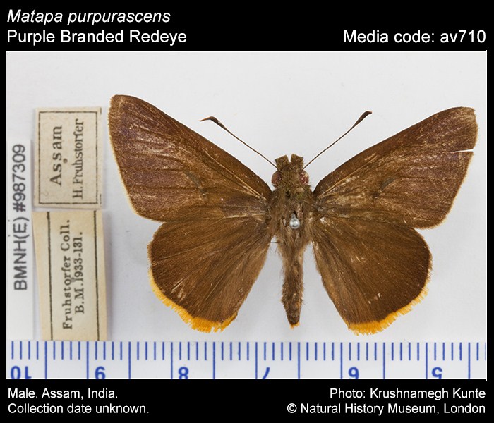 Anonymous 2025. Matapa purpurascens Elwes & Edwards, 1897 – Purple Branded Redeye. In Kunte, K., S. Sondhi, and P. Roy (Chief Editors). Butterflies of India, v. 4.12. Published by the Indian Foundation for Butterflies. URL: https://www.ifoundbutterflies.org/matapa-purpurascens, accessed 2025/10/25.