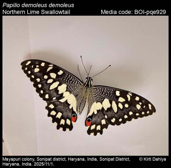 Saji, K., H. Ogale, A. Bora, Manoj P., D. Sawant, A. D. Nair 2025. Papilio demoleus Linnaeus, 1758 – Lime Swallowtail. In Kunte, K., S. Sondhi, and P. Roy (Chief Editors). Butterflies of India, v. 4.12. Published by the Indian Foundation for Butterflies. URL: https://www.ifoundbutterflies.org/papilio-demoleus, accessed 2025/12/06.