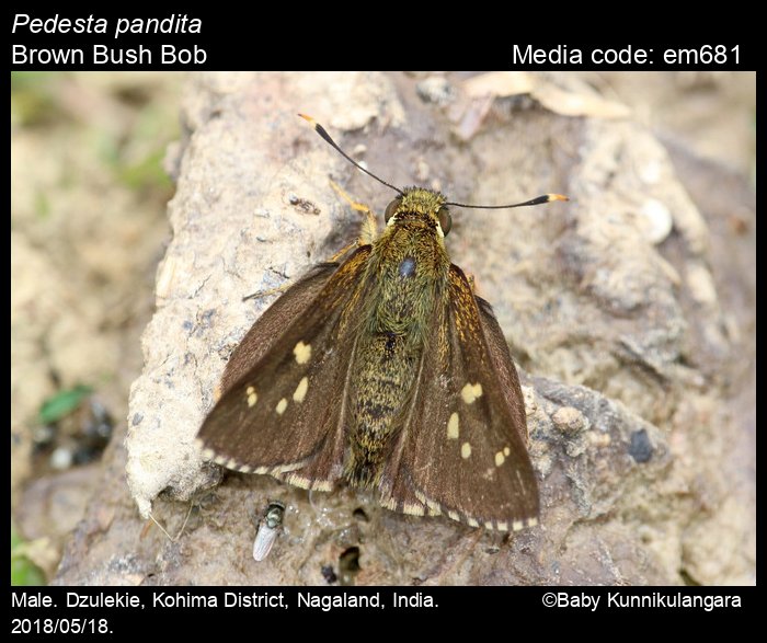 Anonymous 2025. Pedesta pandita (de Nicéville, 1885) – Brown Bush Bob. In Kunte, K., S. Sondhi, and P. Roy (Chief Editors). Butterflies of India, v. 4.12. Published by the Indian Foundation for Butterflies. URL: https://www.ifoundbutterflies.org/pedesta-pandita, accessed 2025/12/06.