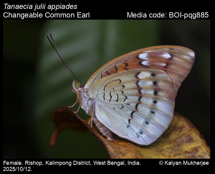 Anonymous 2025. Tanaecia julii (Lesson, 1837) – Common Earl. In Kunte, K., S. Sondhi, and P. Roy (Chief Editors). Butterflies of India, v. 4.12. Published by the Indian Foundation for Butterflies. URL: https://www.ifoundbutterflies.org/tanaecia-julii, accessed 2025/12/31.