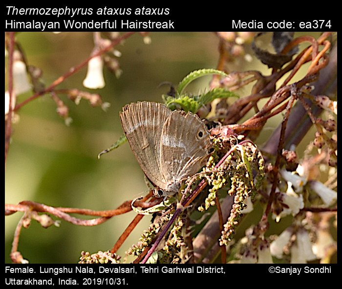 Anonymous 2025. Thermozephyrus ataxus (Westwood, [1851]) – Wonderful Hairstreak. In Kunte, K., S. Sondhi, and P. Roy (Chief Editors). Butterflies of India, v. 4.12. Published by the Indian Foundation for Butterflies. URL: https://www.ifoundbutterflies.org/thermozephyrus-ataxus, accessed 2025/10/23.
