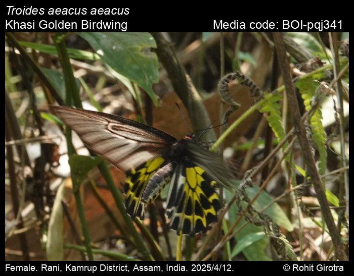 Anonymous 2026. Troides aeacus (C. & R. Felder, 1860) – Golden Birdwing. In Kunte, K., S. Sondhi, and P. Roy (Chief Editors). Butterflies of India, v. 4.12. Published by the Indian Foundation for Butterflies. URL: https://www.ifoundbutterflies.org/troides-aeacus, accessed 2026/03/10.