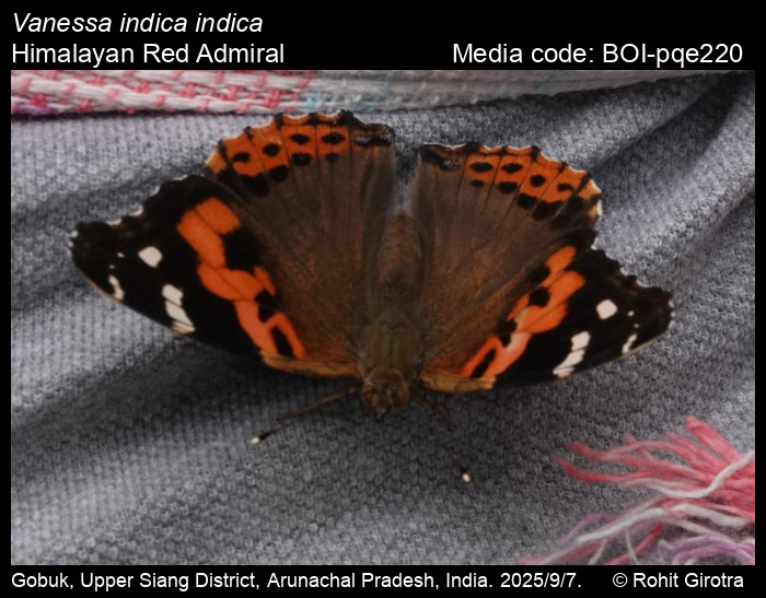 Kunte, K. & A. Sengupta 2025. Vanessa indica (Herbst, 1794) – Indian Red Admiral. In Kunte, K., S. Sondhi, and P. Roy (Chief Editors). Butterflies of India, v. 4.12. Published by the Indian Foundation for Butterflies. URL: https://www.ifoundbutterflies.org/vanessa-indica, accessed 2025/10/16.