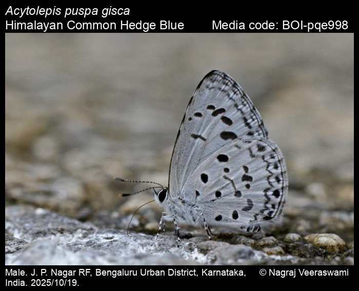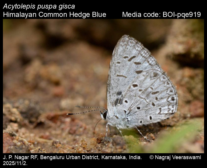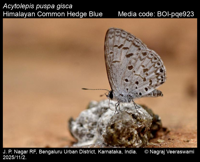 Saji, K., H. Ogale, A. Soman, P. Churi, S. Mazumder, and K. Kunte 2025. Acytolepis puspa (Horsfield, [1828]) – Common Hedge Blue. In Kunte, K., S. Sondhi, and P. Roy (Chief Editors). Butterflies of India, v. 4.12. Published by the Indian Foundation for Butterflies. URL: https://www.ifoundbutterflies.org/acytolepis-puspa, accessed 2025/11/17.
