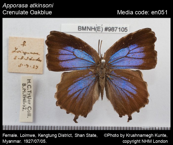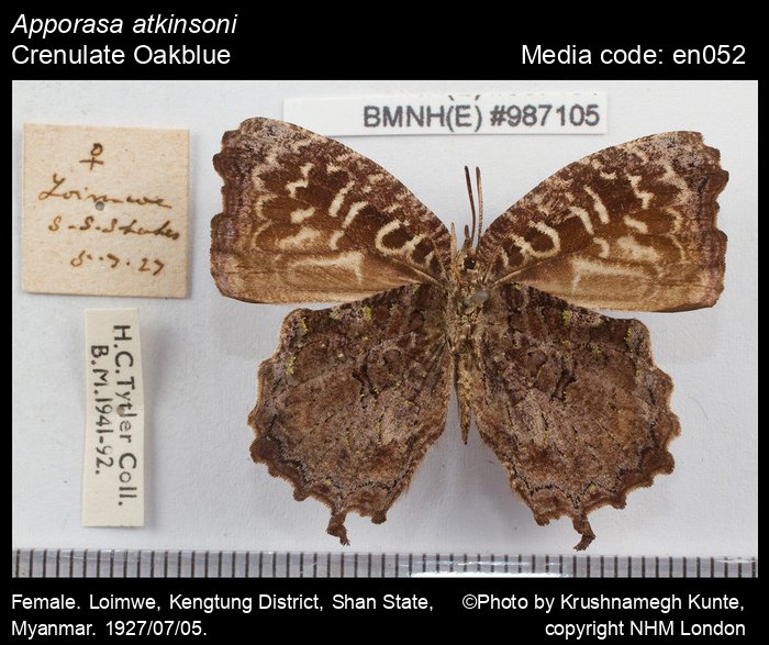 Anonymous 2025. Apporasa atkinsoni (Hewitson, [1869]) – Crenulate Oakblue. In Kunte, K., S. Sondhi, and P. Roy (Chief Editors). Butterflies of India, v. 4.12. Published by the Indian Foundation for Butterflies. URL: https://www.ifoundbutterflies.org/apporasa-atkinsoni, accessed 2025/10/30.