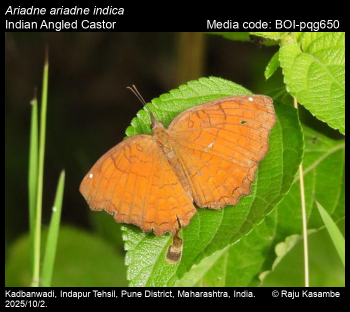 K. Saji, H. Ogale, M. Bhakare, N. Kawthankar, and K. Kunte 2025. Ariadne ariadne (Linnaeus, 1763) – Angled Castor. In Kunte, K., S. Sondhi, and P. Roy (Chief Editors). Butterflies of India, v. 4.12. Published by the Indian Foundation for Butterflies. URL: https://www.ifoundbutterflies.org/ariadne-ariadne, accessed 2025/12/05.
