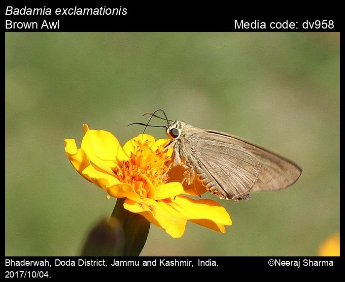 Saji, K., H. Ogale, Manoj P & Prashanth S. N. 2025. Badamia exclamationis (Fabricius, 1775) – Brown Awl. In Kunte, K., S. Sondhi, and P. Roy (Chief Editors). Butterflies of India, v. 4.12. Published by the Indian Foundation for Butterflies. URL: https://www.ifoundbutterflies.org/badamia-exclamationis, accessed 2025/12/16.