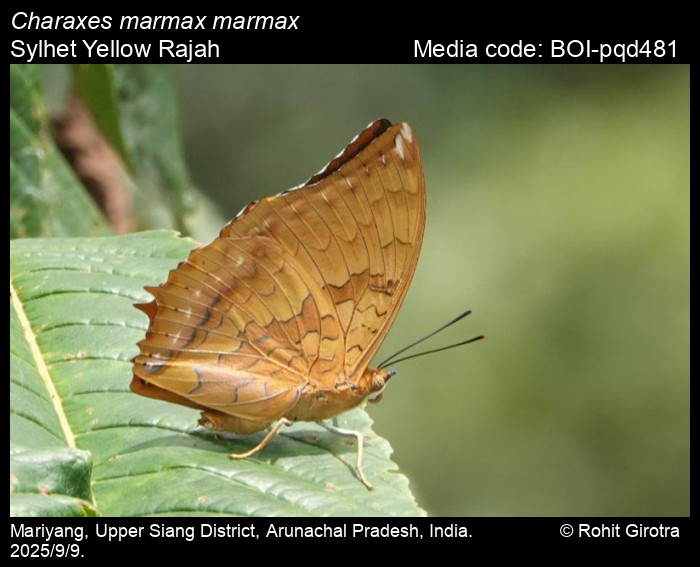 Anonymous 2025. Charaxes marmax Westwood, 1847 – Yellow Rajah. In Kunte, K., S. Sondhi, and P. Roy (Chief Editors). Butterflies of India, v. 4.12. Published by the Indian Foundation for Butterflies. URL: https://www.ifoundbutterflies.org/charaxes-marmax, accessed 2025/10/06.