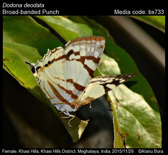 Anonymous 2025. Dodona deodata Hewitson, 1876 – Broad-banded Punch. In Kunte, K., S. Sondhi, and P. Roy (Chief Editors). Butterflies of India, v. 4.12. Published by the Indian Foundation for Butterflies. URL: https://www.ifoundbutterflies.org/dodona-deodata, accessed 2025/10/25.