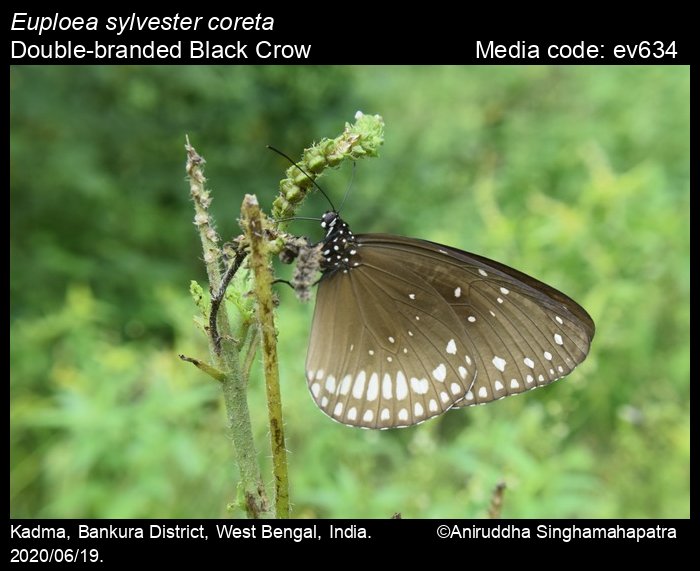 Anonymous 2025. Euploea sylvester (Fabricius, 1793) – Double-branded Crow. In Kunte, K., S. Sondhi, and P. Roy (Chief Editors). Butterflies of India, v. 4.12. Published by the Indian Foundation for Butterflies. URL: https://www.ifoundbutterflies.org/euploea-sylvester, accessed 2025/12/16.