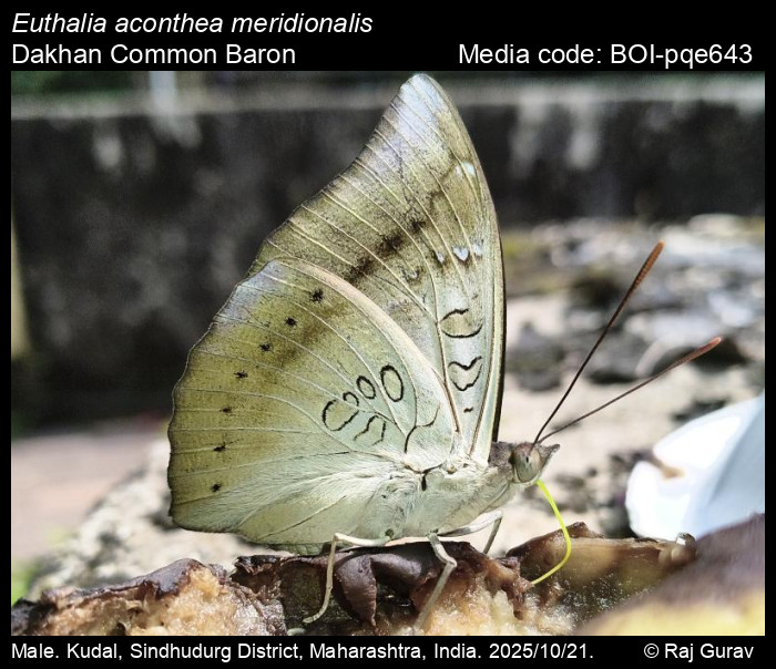 Saji K., K. Kunte, P. Churi, T. Bhagwat, Manoj P., S. Debnath, and R. Girotra 2025. Euthalia aconthea (Cramer, [1777]) – Common Baron. In Kunte, K., S. Sondhi, and P. Roy (Chief Editors). Butterflies of India, v. 4.12. Published by the Indian Foundation for Butterflies. URL: https://www.ifoundbutterflies.org/euthalia-aconthea, accessed 2025/11/03.