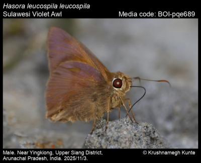 Kunte, K. 2025. Hasora leucospila (Mabille, 1891) – Violet Awl. In Kunte, K., S. Sondhi, and P. Roy (Chief Editors). Butterflies of India, v. 4.12. Published by the Indian Foundation for Butterflies. URL: https://www.ifoundbutterflies.org/hasora-leucospila, accessed 2025/11/07.