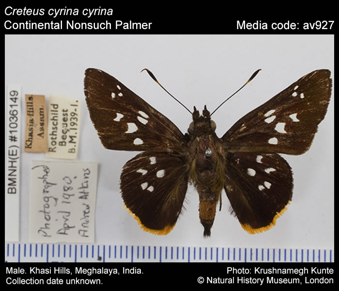 Anonymous 2025. Creteus cyrina (Hewitson, 1876) – Nonsuch Palmer. In Kunte, K., S. Sondhi, and P. Roy (Chief Editors). Butterflies of India, v. 4.12. Published by the Indian Foundation for Butterflies. URL: https://www.ifoundbutterflies.org/index.php/creteus-cyrina, accessed 2025/11/03.