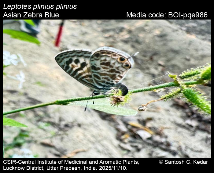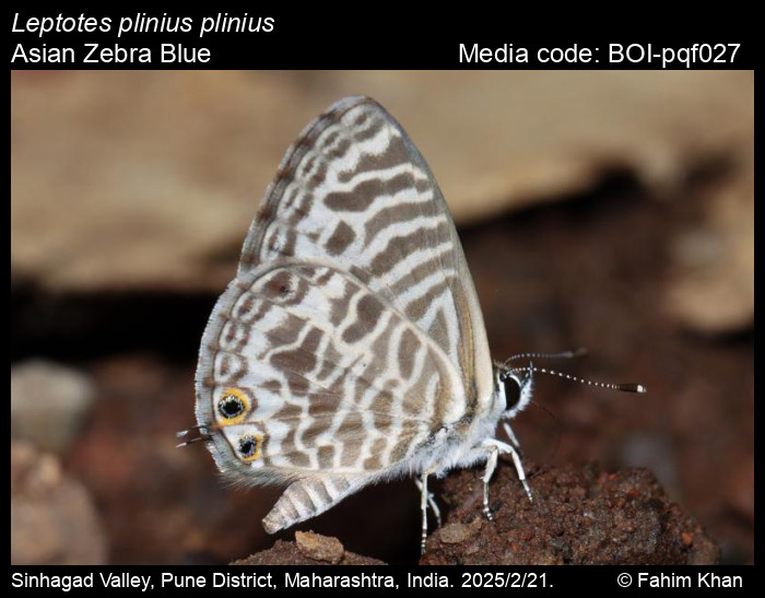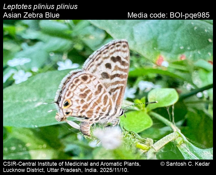 Saji, K, P. Churi, and R. P. Mahajan 2025. Leptotes plinius (Fabricius, 1793) – Zebra Blue. In Kunte, K., S. Sondhi, and P. Roy (Chief Editors). Butterflies of India, v. 4.12. Published by the Indian Foundation for Butterflies. URL: https://www.ifoundbutterflies.org/index.php/leptotes-plinius, accessed 2025/11/21.