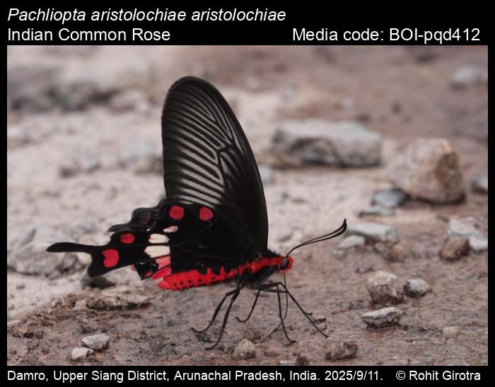 Bhakare, M., K. Saji, S. Mazumder, and Swathi H. A 2025. Pachliopta aristolochiae (Fabricius, 1775) – Common Rose. In Kunte, K., S. Sondhi, and P. Roy (Chief Editors). Butterflies of India, v. 4.12. Published by the Indian Foundation for Butterflies. URL: https://www.ifoundbutterflies.org/index.php/pachliopta-aristolochiae, accessed 2025/10/08.