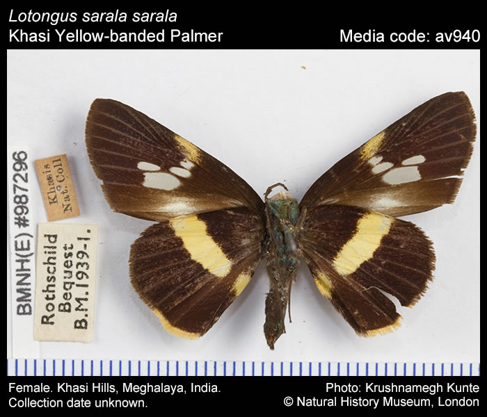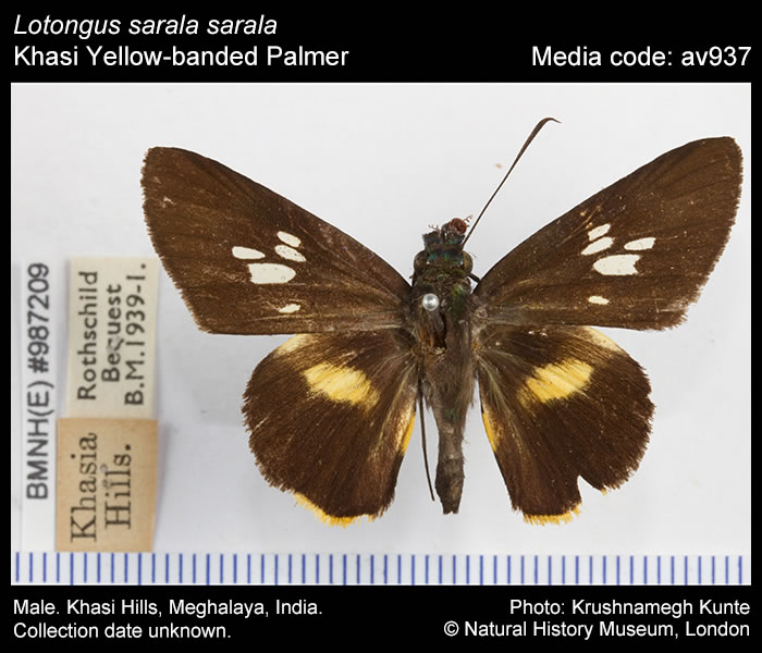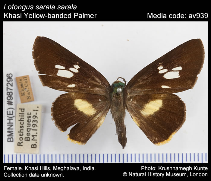 Anonymous 2025. Lotongus sarala (de Nicéville, 1889) – Yellow-banded Palmer. In Kunte, K., S. Sondhi, and P. Roy (Chief Editors). Butterflies of India, v. 4.12. Published by the Indian Foundation for Butterflies. URL: https://www.ifoundbutterflies.org/lotongus-sarala, accessed 2025/10/25.