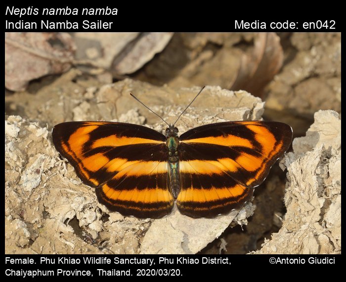 Anonymous 2025. Neptis namba Tytler, 1915 – Namba Sailer. In Kunte, K., S. Sondhi, and P. Roy (Chief Editors). Butterflies of India, v. 4.12. Published by the Indian Foundation for Butterflies. URL: https://www.ifoundbutterflies.org/neptis-namba, accessed 2025/10/26.