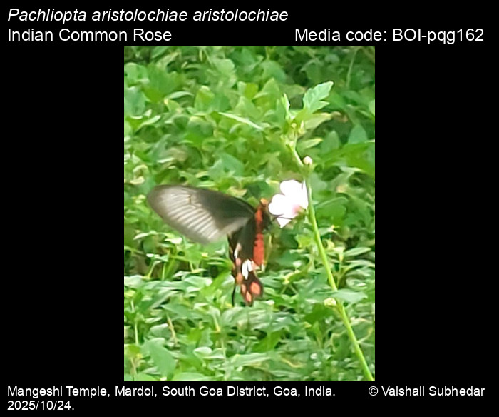 Bhakare, M., K. Saji, S. Mazumder, and Swathi H. A 2025. Pachliopta aristolochiae (Fabricius, 1775) – Common Rose. In Kunte, K., S. Sondhi, and P. Roy (Chief Editors). Butterflies of India, v. 4.12. Published by the Indian Foundation for Butterflies. URL: https://www.ifoundbutterflies.org/pachliopta-aristolochiae, accessed 2025/11/28.