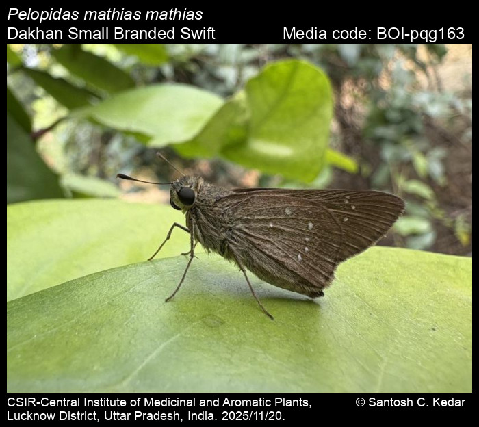 Chandrasekharan, V.K., and A. Rane 2025. Pelopidas mathias (Fabricius, 1798) – Small Branded Swift. In Kunte, K., S. Sondhi, and P. Roy (Chief Editors). Butterflies of India, v. 4.12. Published by the Indian Foundation for Butterflies. URL: https://www.ifoundbutterflies.org/pelopidas-mathias, accessed 2025/11/23.