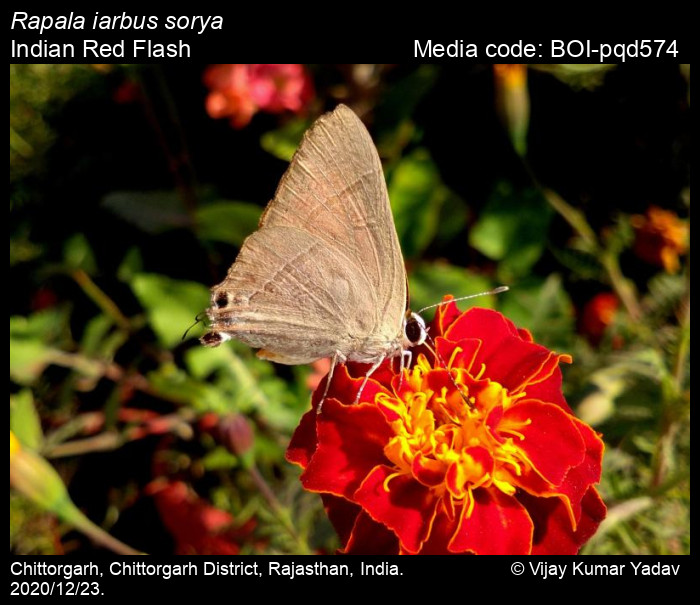 Anonymous 2025. Rapala iarbus (Fabricius, 1787) – Common Red Flash. In Kunte, K., S. Sondhi, and P. Roy (Chief Editors). Butterflies of India, v. 4.12. Published by the Indian Foundation for Butterflies. URL: https://www.ifoundbutterflies.org/rapala-iarbus, accessed 2025/10/08.