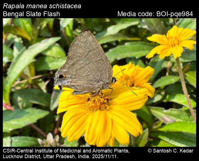 Anonymous 2025. Rapala manea (Hewitson, 1863) – Slate Flash. In Kunte, K., S. Sondhi, and P. Roy (Chief Editors). Butterflies of India, v. 4.12. Published by the Indian Foundation for Butterflies. URL: https://www.ifoundbutterflies.org/rapala-manea, accessed 2025/11/17.