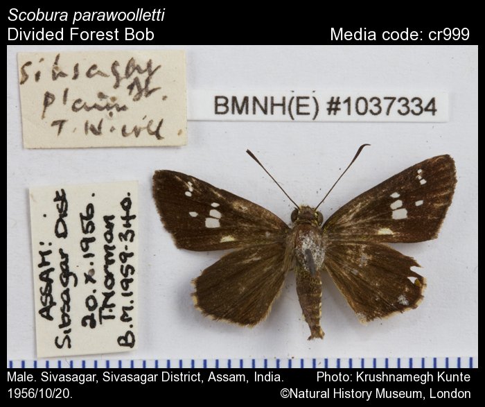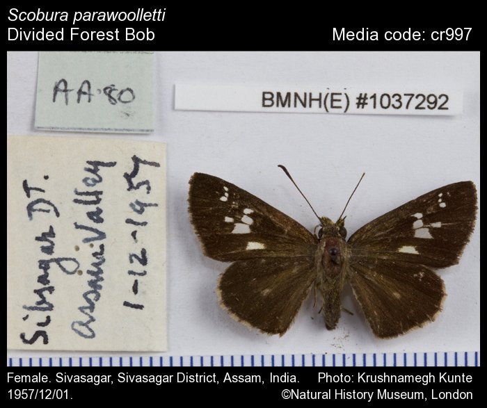 Anonymous 2025. Scobura parawoolletti Fan, Chiba & Wang, 2010 – Divided Forest Bob. In Kunte, K., S. Sondhi, and P. Roy (Chief Editors). Butterflies of India, v. 4.12. Published by the Indian Foundation for Butterflies. URL: https://www.ifoundbutterflies.org/scobura-parawoolletti, accessed 2025/10/29.